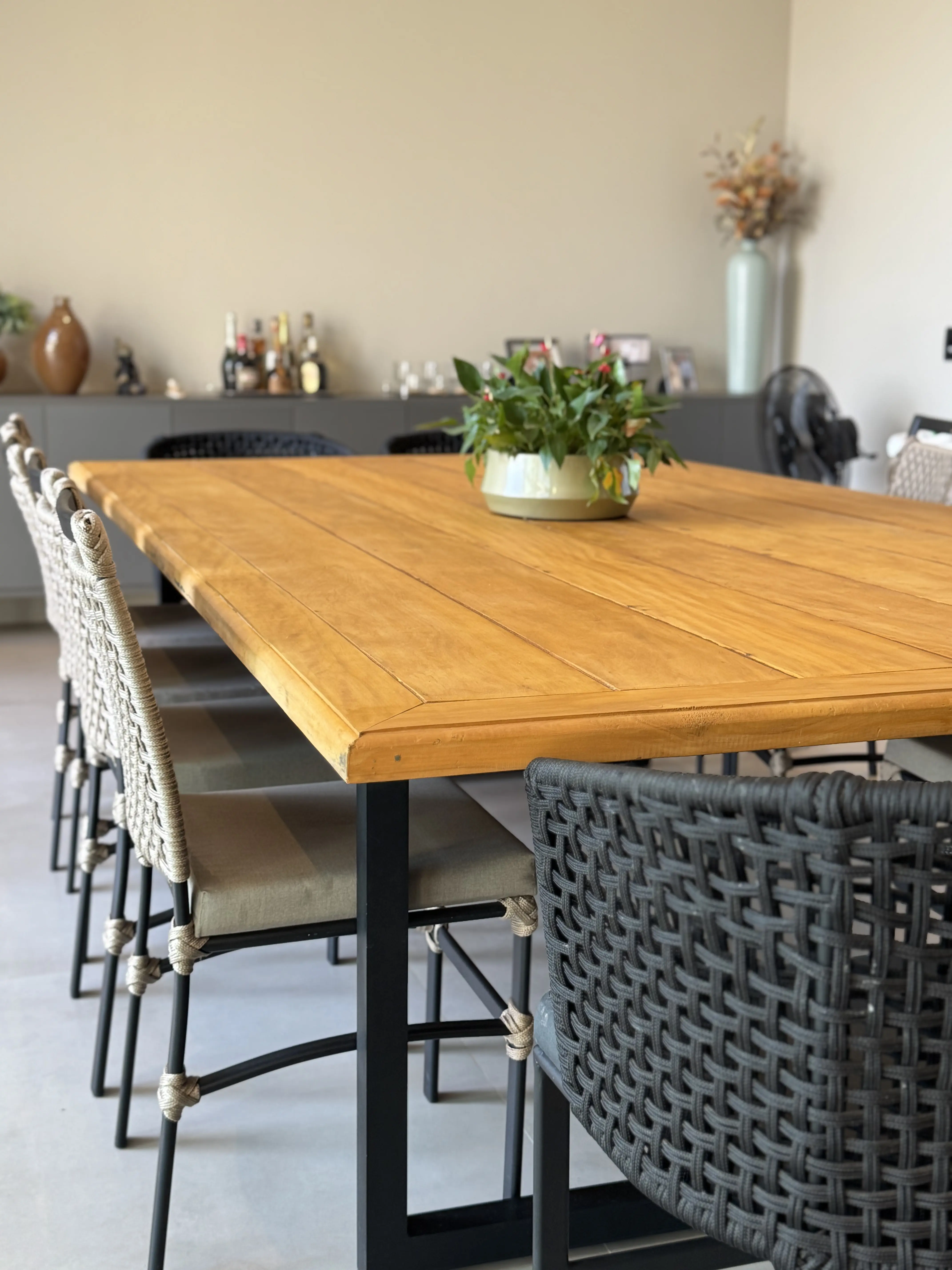 Para móveis de madeira de demolição, utilizamos a própria madeira maciça como estrutura, garantindo resistência e durabilidade. Já os móveis em fibra sintética possuem estrutura de alumínio de alta qualidade, que é leve, resistente à corrosão e ideal para áreas externas.