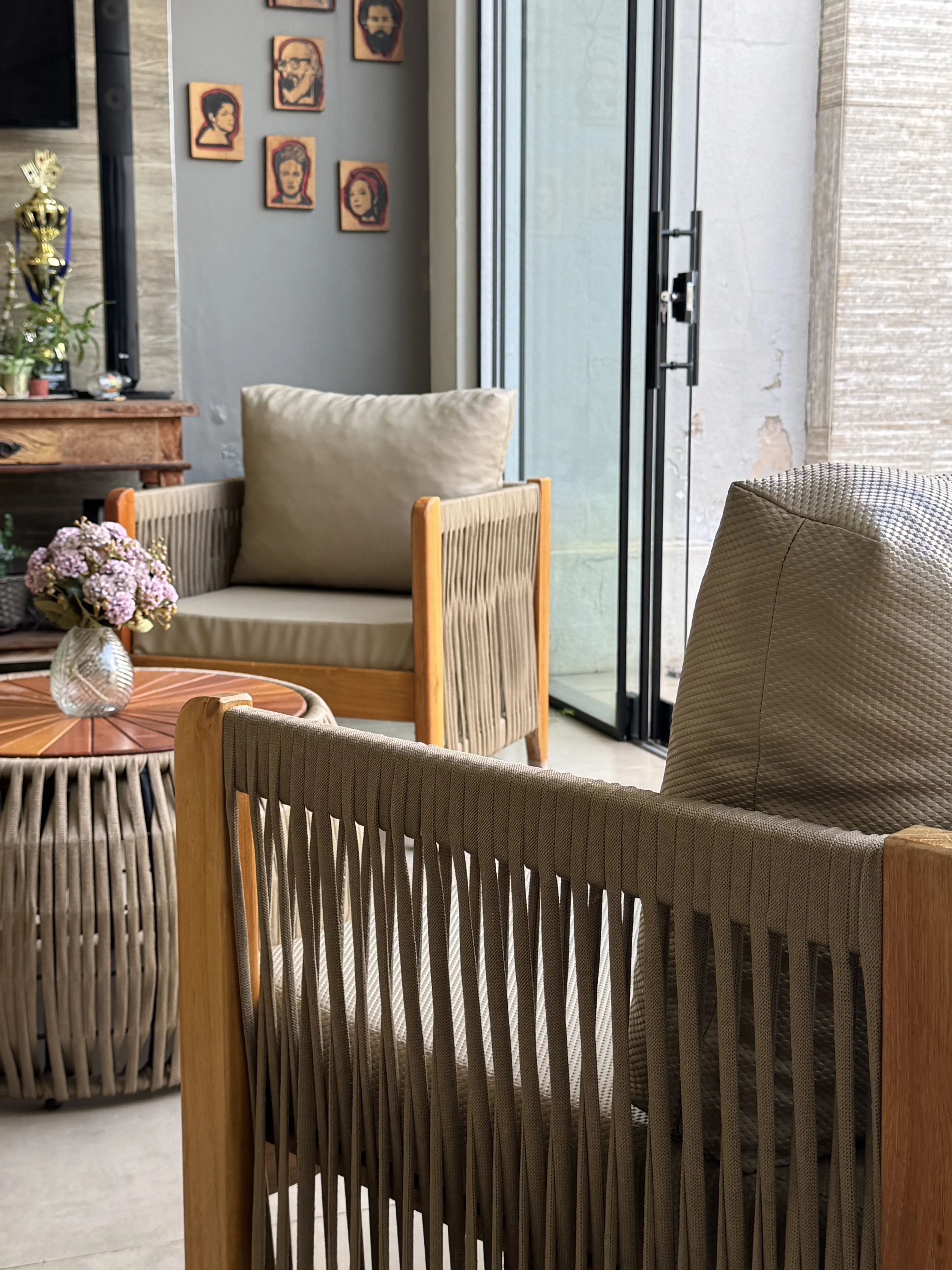 "Precisava de uns móveis bacanas pra varanda do escritório. Peguei uns em fibra sintética e nossa, parece tecido mesmo! E olha que pega sol e chuva direto."
